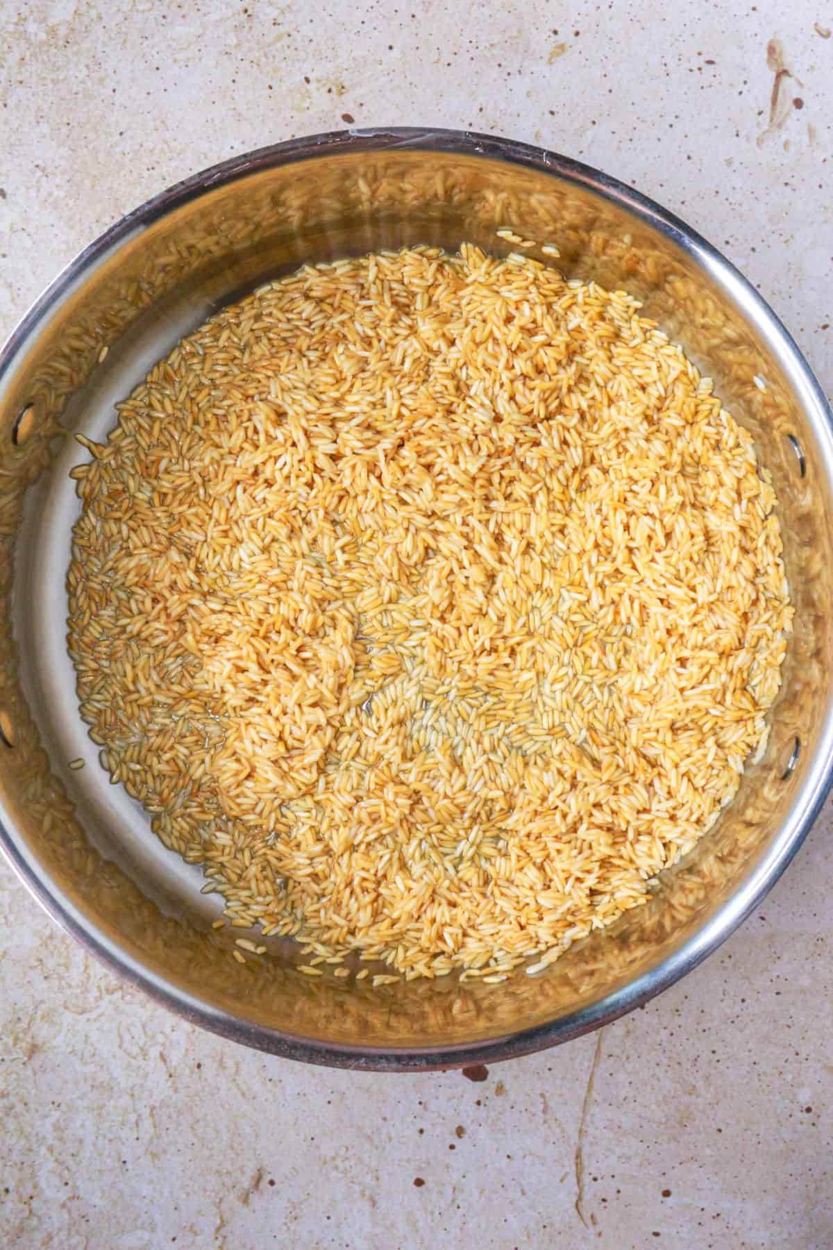 - Using a wooden spoon, sauté the rice until it turns a golden-brown color (be careful it does not burn). This should take about 5-7 minutes.